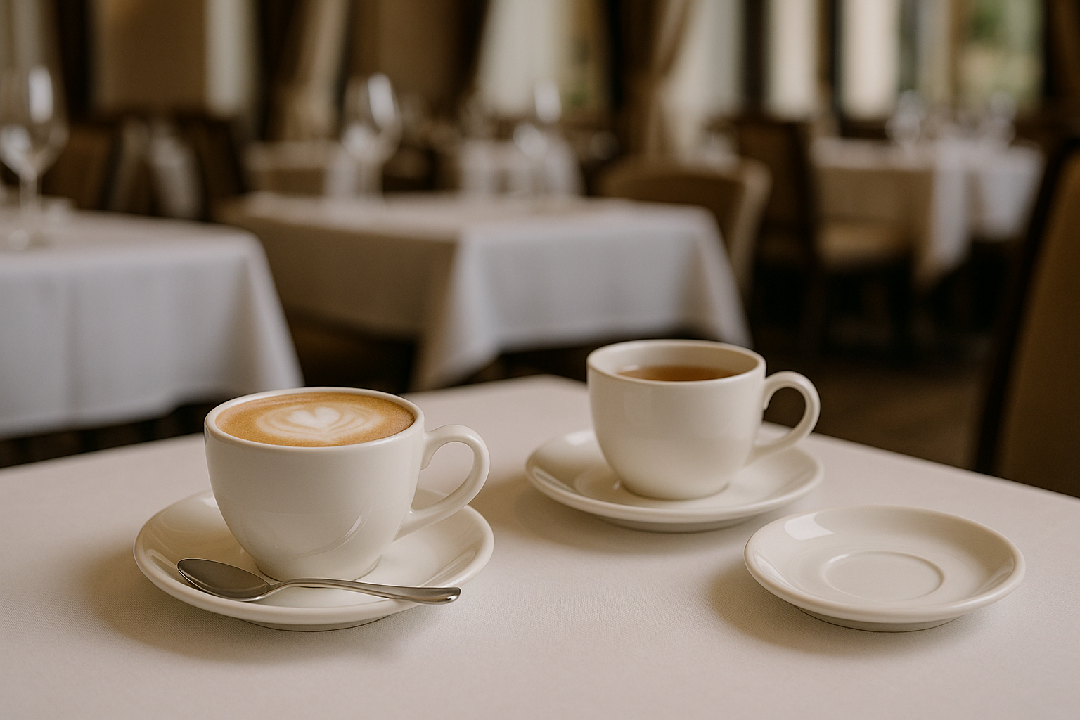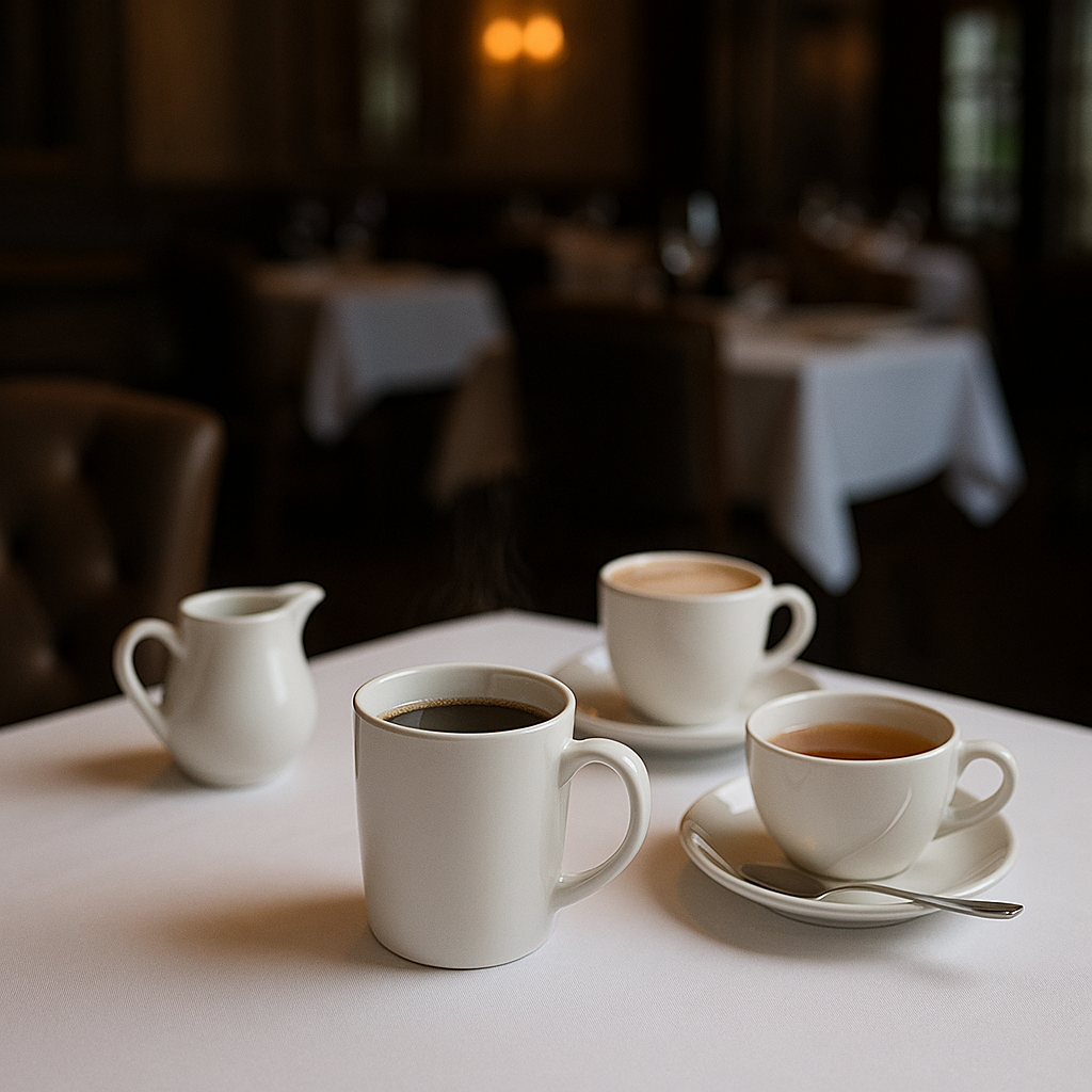 Elevate your coffee service with an elegant table display featuring china mugs and matching saucers.