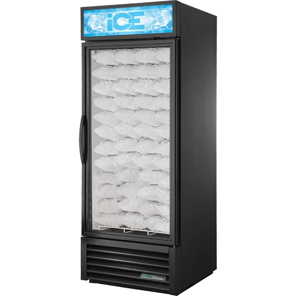 Elevate your foodservice operations with the TRUE 30" 1-Glass Door No Tank Freezer Ice Merchandiser (GDIM-26NT-HC~TSL01), designed specifically for commercial environments. This innovative ice merchandiser holds up to (54) 8-pound bags of ice, ensuring your customers have easy access to what they need. Featuring a sleek, commercial-grade exterior and a low-E thermal glass hinged swing door, it combines functionality with style. The interior LED lighting enhances visibility while the durable stainless steel floor withstands the demands of high-traffic use. With a 1/3 HP compressor and energy-efficient design, this unit not only maintains consistent temperatures but also helps reduce operating costs. The adjustable shelving and robust air circulation system optimize storage, making it a perfect addition to convenience stores, hotels, and catering businesses. Certified by cULus and UL EPH, this reliable piece of professional kitchen equipment embodies TRUE Refrigeration's commitment to quality and durability. Keep your products fresh and your business running smoothly — TRUE Refrigeration has you covered.